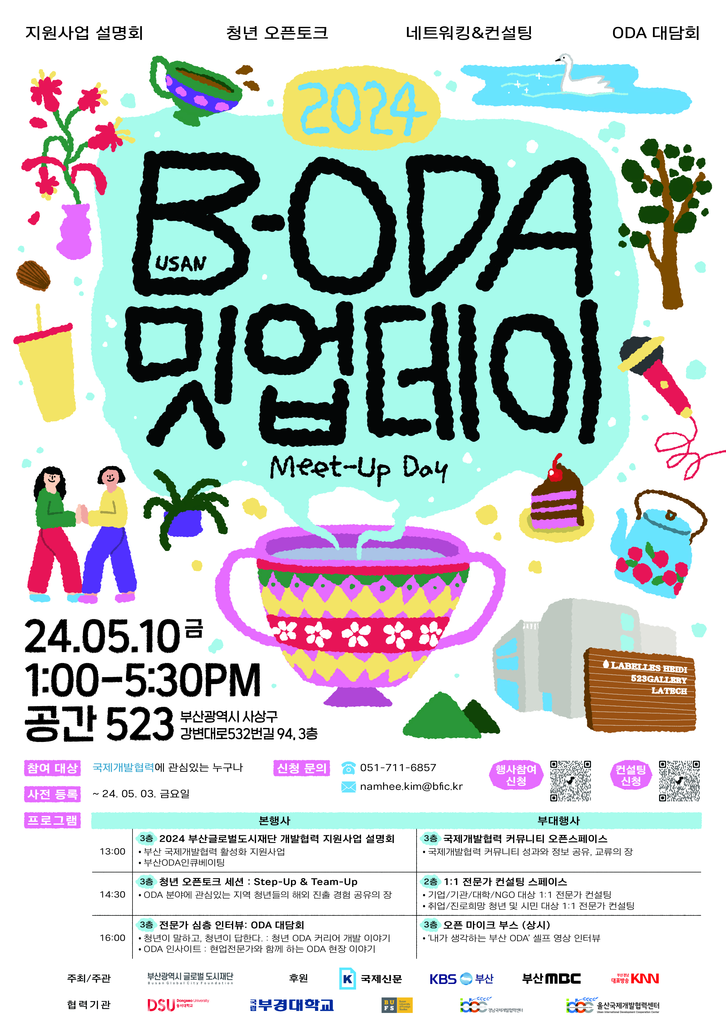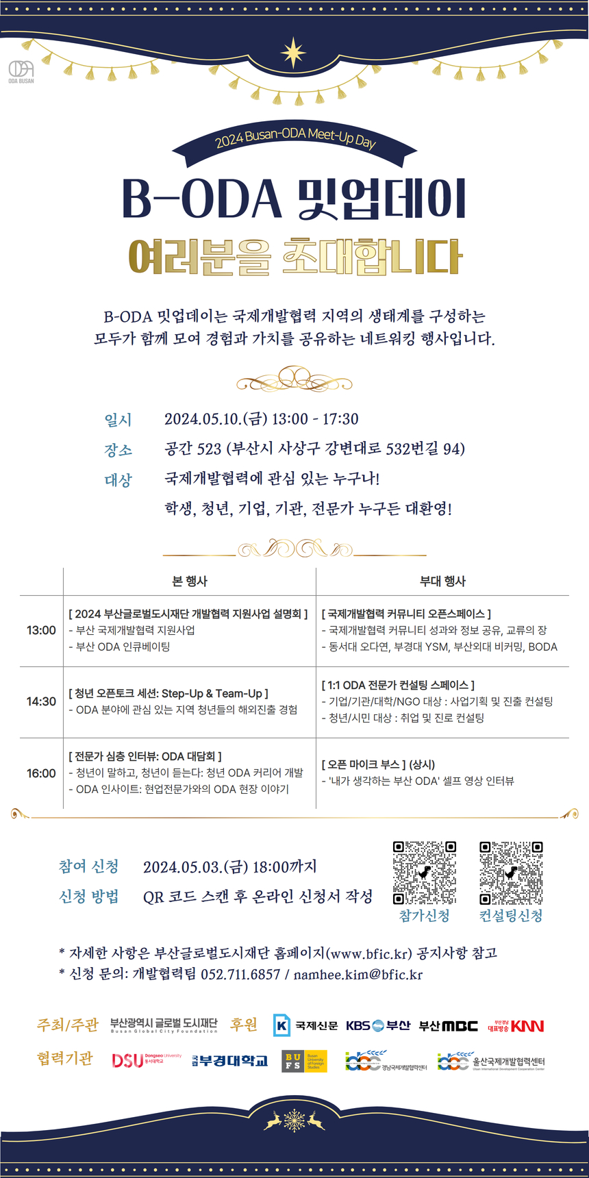 부산글로벌도시재단은 지역의 ODA 인식 확산 및 참여 확대를 위해 ODA 생태계를 구성하는 청년-기업-기관-전문가가 함께 정보와 경험을 교류하는 네크워킹 행사인 「2024 B-ODA 밋업데이를 개최합니다. 부산의 국제개발협력 활성화 사업지원 설명회, 청년 오픈토크, ODA 대담회 뿐만 아니라 ODA 전문가와 만남의 통해 고민이나 궁금증을 해결하고, 커뮤니티를 형성할 수 있는 자리입니다. 개발협력에 대해 관심을 가지고 있거나 공부하고 있는 학생들에게 추천합니다.