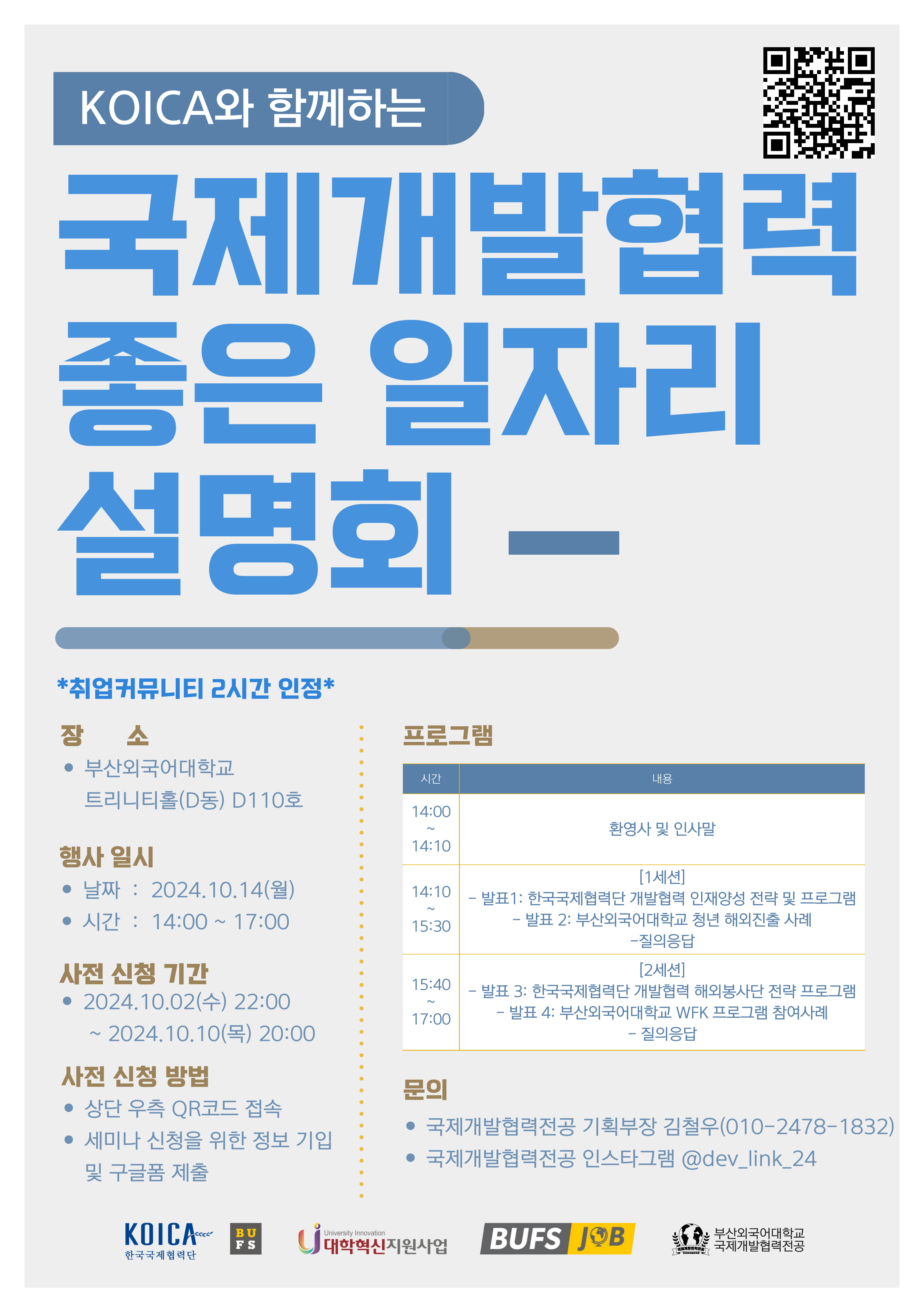KOICA와 부산외국어대학교 지산학센터, 진로취업처, 국제개발협력전공이 함께 주최하는 개발협력 좋은 일자리 설명회는 국가 공공기관인 KOICA에서 직접 방문하여 일자리에 대해 설명하는 행사입니다.