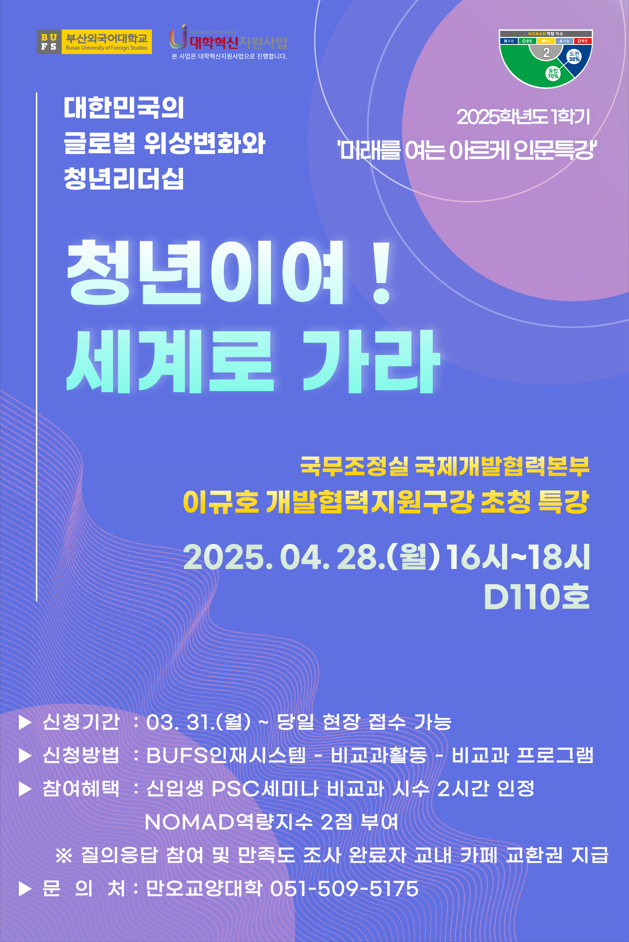 [행사 신청 안내] 4/28(월) 청년이여 세계로 가라: 대한민국의 글로벌 위상변화와 청년리더 - 이규호 외교관 초청강연회